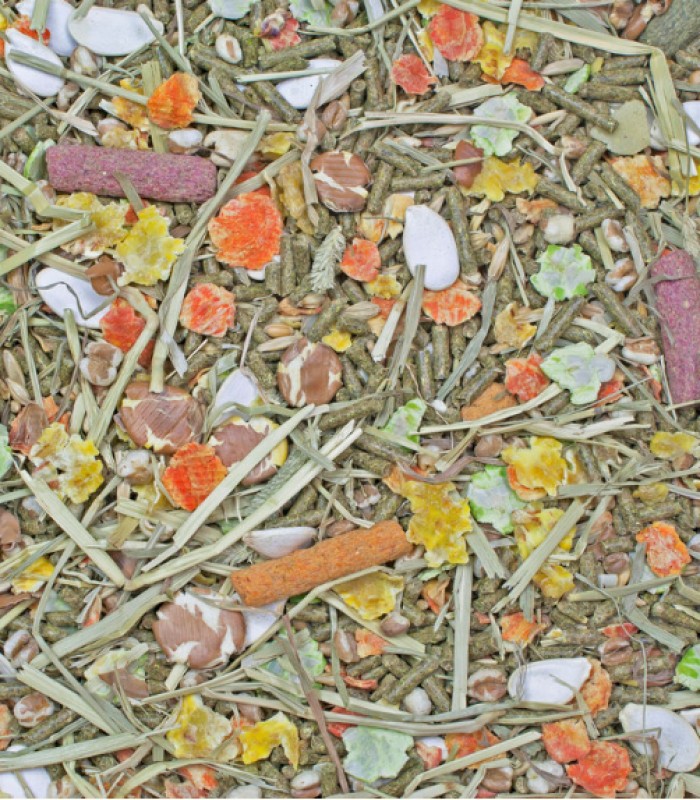 Alfalfa Meal, Soybean Hulls, Wheat Middlings, Soybean Meal, Flaked Peas, Flaked Beans, Oats, Wheat, Monocalcium Phosphate, Flaked Carrots, Flaked Corn, Ground Corn, Pumpkin Seeds, Barley, Sun-Cured Timothy Hay, Papaya, Pineapple, Ground Carrots, Ground Beets, Salt, Sunflower Oil, Color Added (Algae Meal), DL-Methionine, L-Lysine, Choline Chloride, Calcium Carbonate, Dried Enterococcus Faecium Fermentation Product, Dried Lactobacillus Acidophilus Fermentation Product, Dried Lactobacillus Casei Fermentation Product, Cellulose, Potassium Chloride, Vitamin A Supplement, Vitamin D3 Supplement, Vitamin E Supplement, Zinc Sulfate, Ferrous Sulfate, Niacin, Folic Acid, Biotin, Manganese Sulfate, Copper Sulfate, Calcium Pantothenate, Thiamine Mononitrate, Pyridoxine Hydrochloride, Riboflavin Supplement, Zinc Proteinate, Manganese Proteinate, Copper Proteinate, Calcium Iodate, Yucca Schidigera Extract, Sodium Selenite, Cobalt Carbonate, Vitamin B12 Supplement.